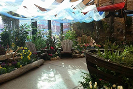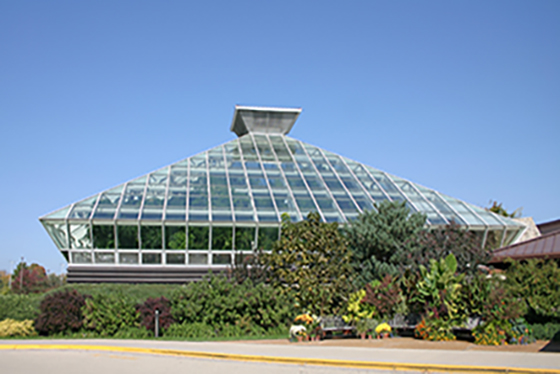 The Olbrich's Bolz Conservatory is a glass pyramid fill with exotic plants, bright flowers, and a rushing waterfall inside the pyramid. Many different plants to explore and birds roaming around the pyramid